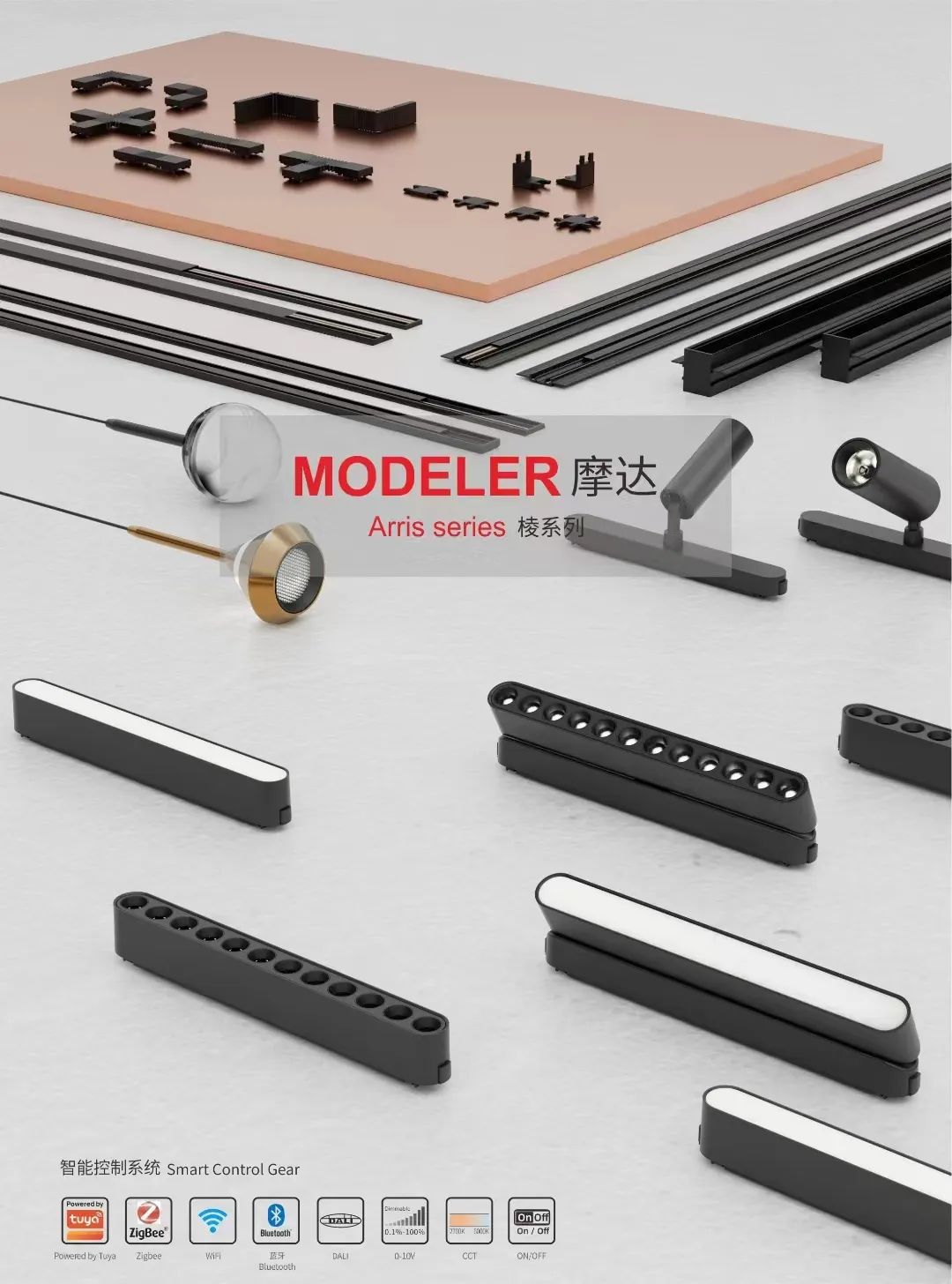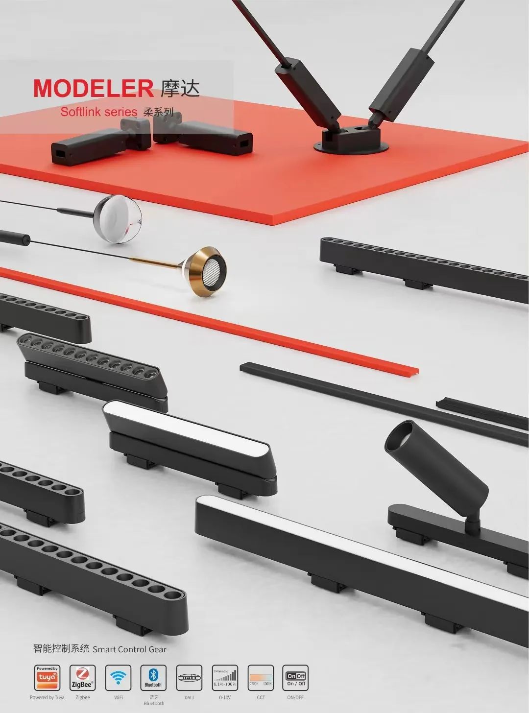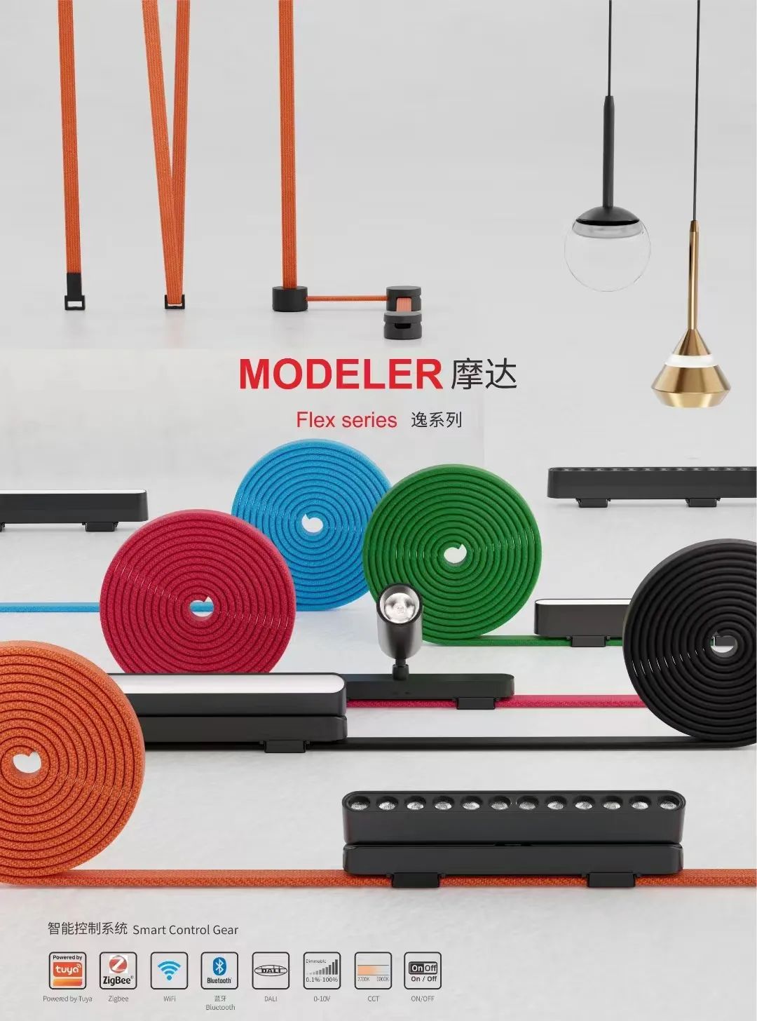 Modeler ·Intelligent(摩达·智享)轨道照明系统是一个在布局层、视觉感官层、互动层等方面都不错探索性的产品。突破了现有照明系统的传统设计,打破固有思维,创新性使用“柔”与“刚”相结合的方式为灯具模块供电平台。通过0.65cm超薄的刚性轨道与硅胶柔性轨道设计进行“硬”“软”相连,做到刚柔并济,光随心悦!摩达模组根据现今用户的多维度需求,深度开发多种功能型产品,产品进行模块化设计,不同的模块可随意安装搭配,可在满足不同空间中基础照明需求的同时提供所需的重点照明,并可兼顾氛围照明,从而达到空间所需的装饰性及艺术性。摩达模组用专业的光学设计兼顾了多种场合的需求,在满足照度需求的同时控制眩光,为用户提供健康、舒适的照明环境。智享平台在轨道内部集成了4条导线,轻松应对目前市场上主流的智能控制系统,实现全屋智能,一切尽在掌握。超薄硬轨道与硅胶柔轨道的结合,在不同设计师的创作下会呈现出不同的视觉冲击效果。摩达·智享是智能、光学、美学的结合体,在实现多功能的前提下,实现全屋智能方案,又具有装饰性,达到实用和审美的完美融合。灵活性 柔性导轨的应用解决了传统导轨受限于结构,角度问题,柔性轨道受空间的限制少,给予设计时更大的自由度,实现更多样化的灯光设计方案。时尚性 柔性钢带、布艺造型个性定制,表面处理多种选择,颜色多变,符合时下年轻人审美,可以实现更多个性时尚的设计。趣味化的设计视觉感和情感化审美设计的融入,提高了使用者设计的感官体验,进而提高用户的参与度。
