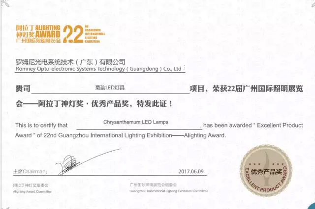 近期,由广州国际照明展览会举办的阿拉丁神灯奖隆重展开,ROMNEY罗姆尼产品“菊韵”系列LED灯具从数千件产品脱颖而出,夺得优秀产品奖。入围评选“十大优秀产品”的环节。