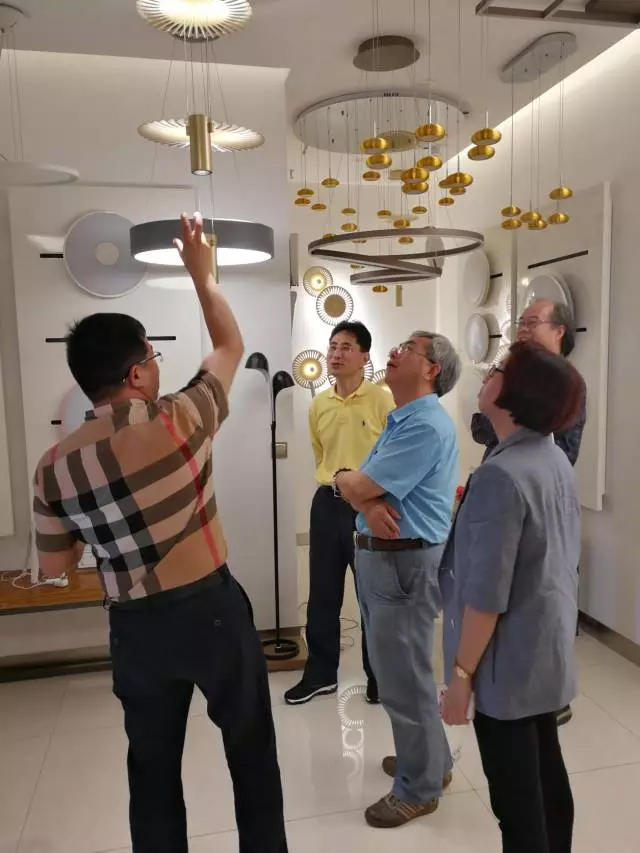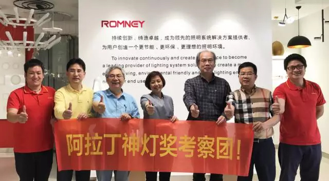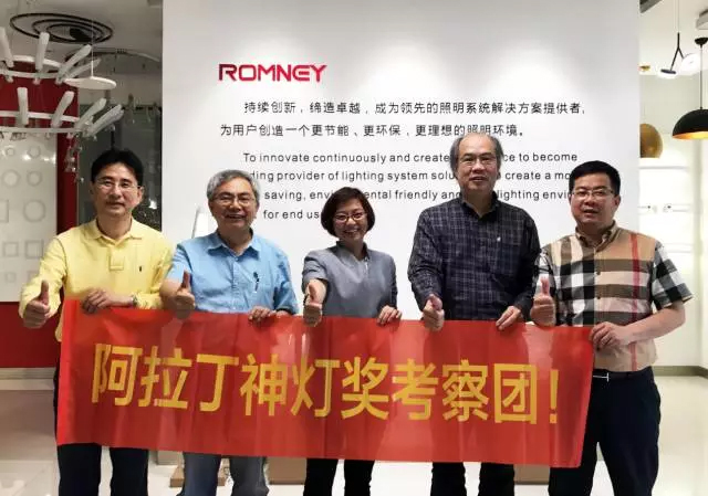 5月5日,阿拉丁神灯奖终审评委台湾科技大学萧弘清教授、南京工业大学王海波教授、郑亚琴秘书长等一行莅临ROMNEY罗姆尼,参观考察公司及入围复审产品“菊韵”系列LED灯具。