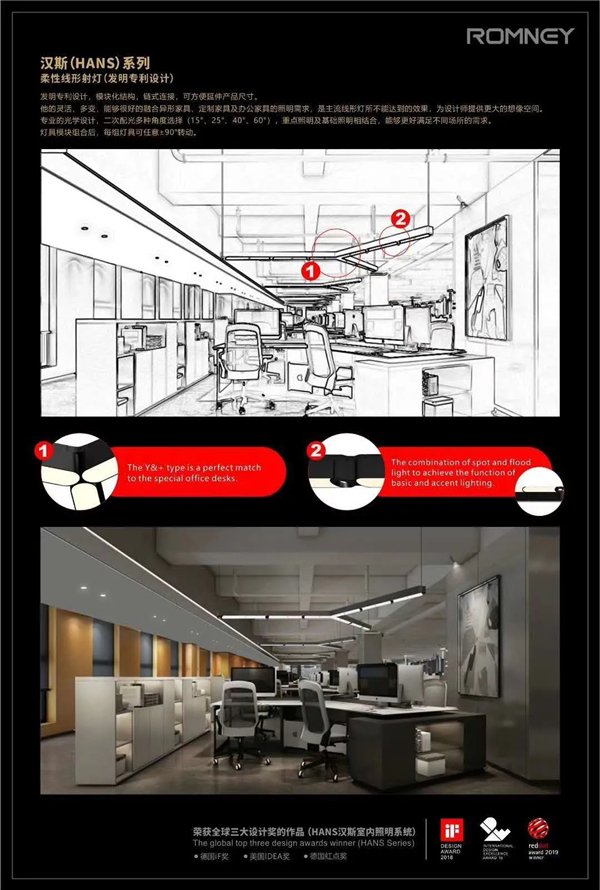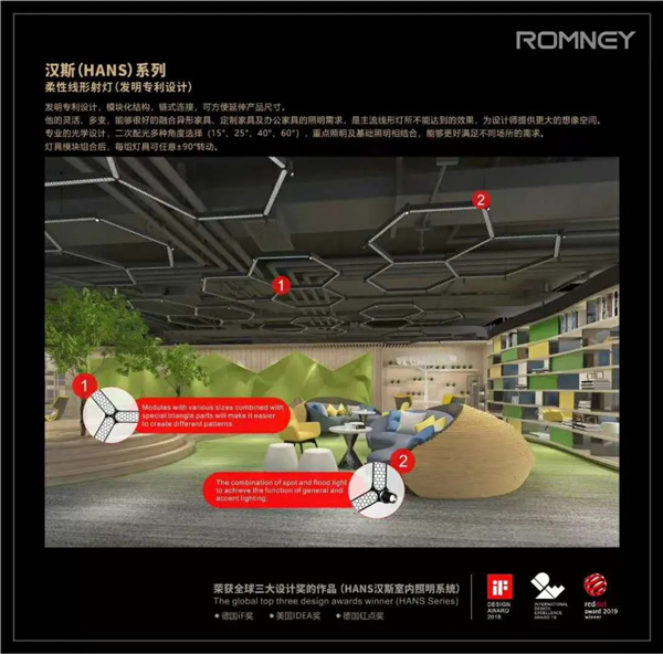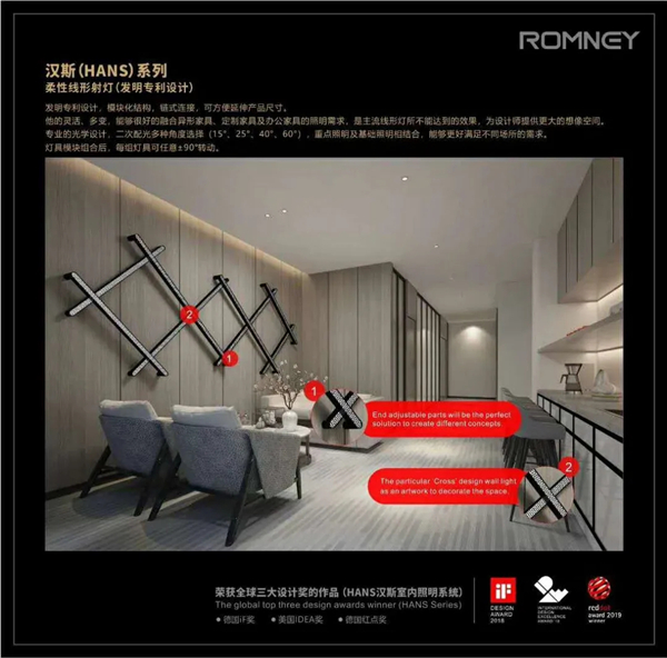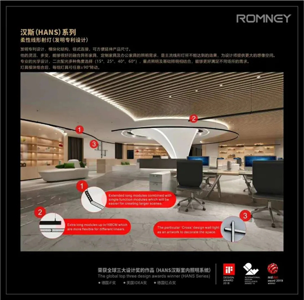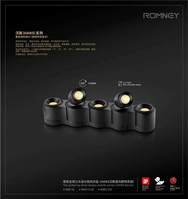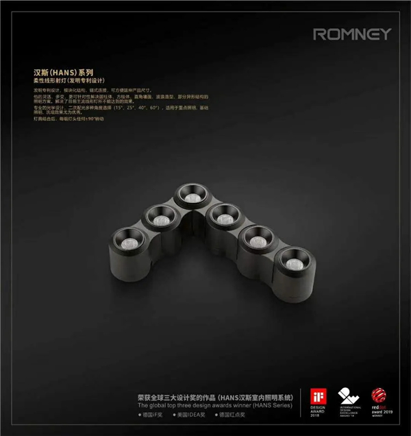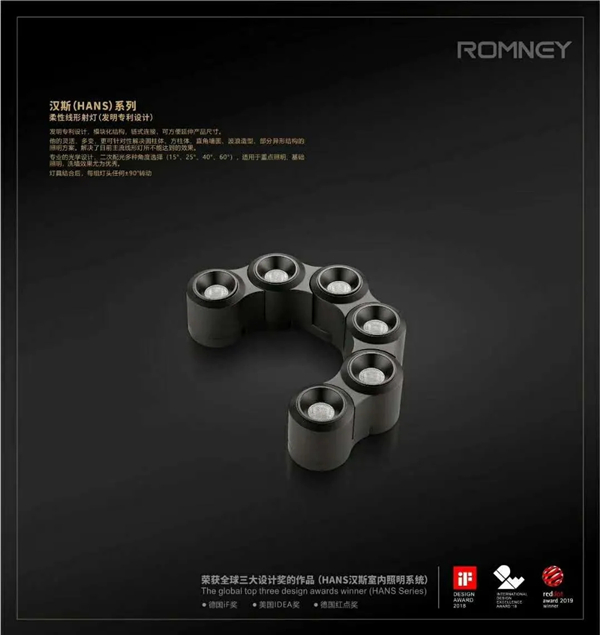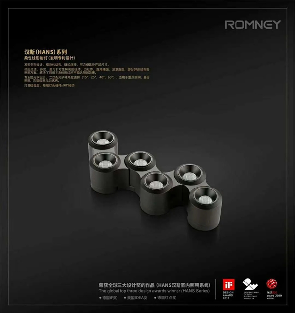 在此之前ROMNEY“HANS汉斯”系列荣获三个全球设计大奖:“德国iF奖”、“美国IDEA奖”、“德国红点奖”。至此ROMNEY“HANS汉斯”已成为全球三大设计奖的大满贯得主!也是中国照明行业唯一获得全球三大设计奖的作品。