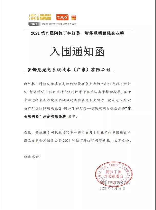 5月12日,阿拉丁神灯奖秘书处传来喜讯,经过评审专家团认真审核和投票,ROMNEY被审定入围 26 届广州国际照明展览会·阿拉丁神灯奖——智能照明百强企业榜“家居照明类”细分领域品牌名单。并邀请ROMNEY参加将于 6 月 9 日在广州中国进出口商品交易会展馆举办的 2021 阿拉丁神灯奖颁奖典礼。