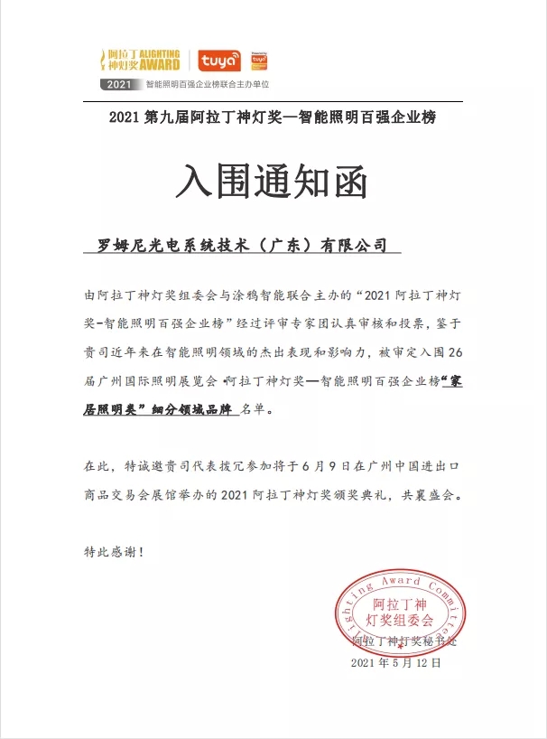 5月12日,阿拉丁神灯奖秘书处传来喜讯,经过评审专家团认真审核和投票,ROMNEY被审定入围 26 届广州国际照明展览会·阿拉丁神灯奖——智能照明百强企业榜“家居照明类”细分领域品牌名单。并邀请ROMNEY参加将于 6 月 9 日在广州中国进出口商品交易会展馆举办的 2021 阿拉丁神灯奖颁奖典礼。