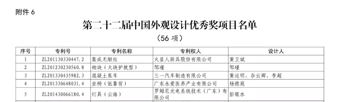 根据《中国专利奖评奖办法》规定,经国务院有关部门知识产权工作管理机构、地方知识产权局、有关全国性行业协会,以及中国科学院院士和中国工程院院士等推荐,中国专利奖评审委员会评审,社会公示,国家知识产权局和世界知识产权组织决定授予“一种测量参考信号的信令配置系统及方法”等30项发明、实用新型专利中国专利金奖,“彩色超声诊断仪”等10项外观设计专利中国外观设计金奖;国家知识产权局决定授予“陶瓷基复合材料的连接方法”等60项发明、实用新型专利中国专利银奖,“扫地机”等15项外观设计专利中国外观设计银奖;国家知识产权局决定授予“一种治疗胃病的中药及其制备工艺”等825项发明、实用新型专利中国专利优秀奖,“集成无烟灶”等56项外观设计专利中国外观设计优秀奖;国家知识产权局决定授予江苏省知识产权局等8家单位中国专利奖最佳组织奖,上海市知识产权局等20家单位中国专利奖优秀组织奖,杨卫等15位院士中国专利奖最佳推荐奖。