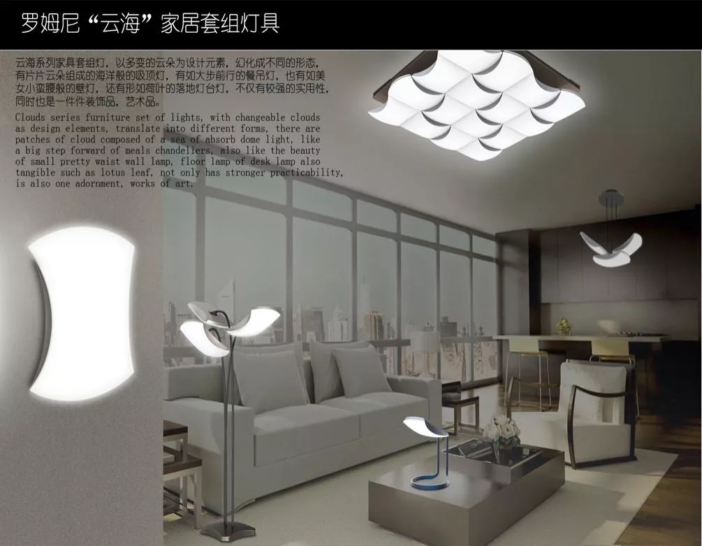 云海系列产品灵感源自泰山云海,逢雨后初晴,在岱顶就会出现白云平铺万里,犹如一个云的海洋,微风吹去,云海浮波....看到这漫无边际的云,如临于大海之滨,波起峰涌,浪花飞溅,惊涛拍岸。本系列产品正是以这起伏的云朵为元素,设计出单一模块,再辅以阵列排布等组合方式,再现泰山云海的恢弘景象,故本系列谓为“云海系列”。单片模块多采用弧形来修饰,发光面为流线型弧线,边角弧形倒角,以体现轻盈优雅,中间弧线造型犹如女子腰肢般柔美婀娜,尽显其优美线型之美。本系列产品设计新颖独到,用统一元素穿插应用在大多数常用的灯具中,既满足了各个空间特有的采光需求,也满足了统一表达产品设计风格和彰显空间设计品位的需求。